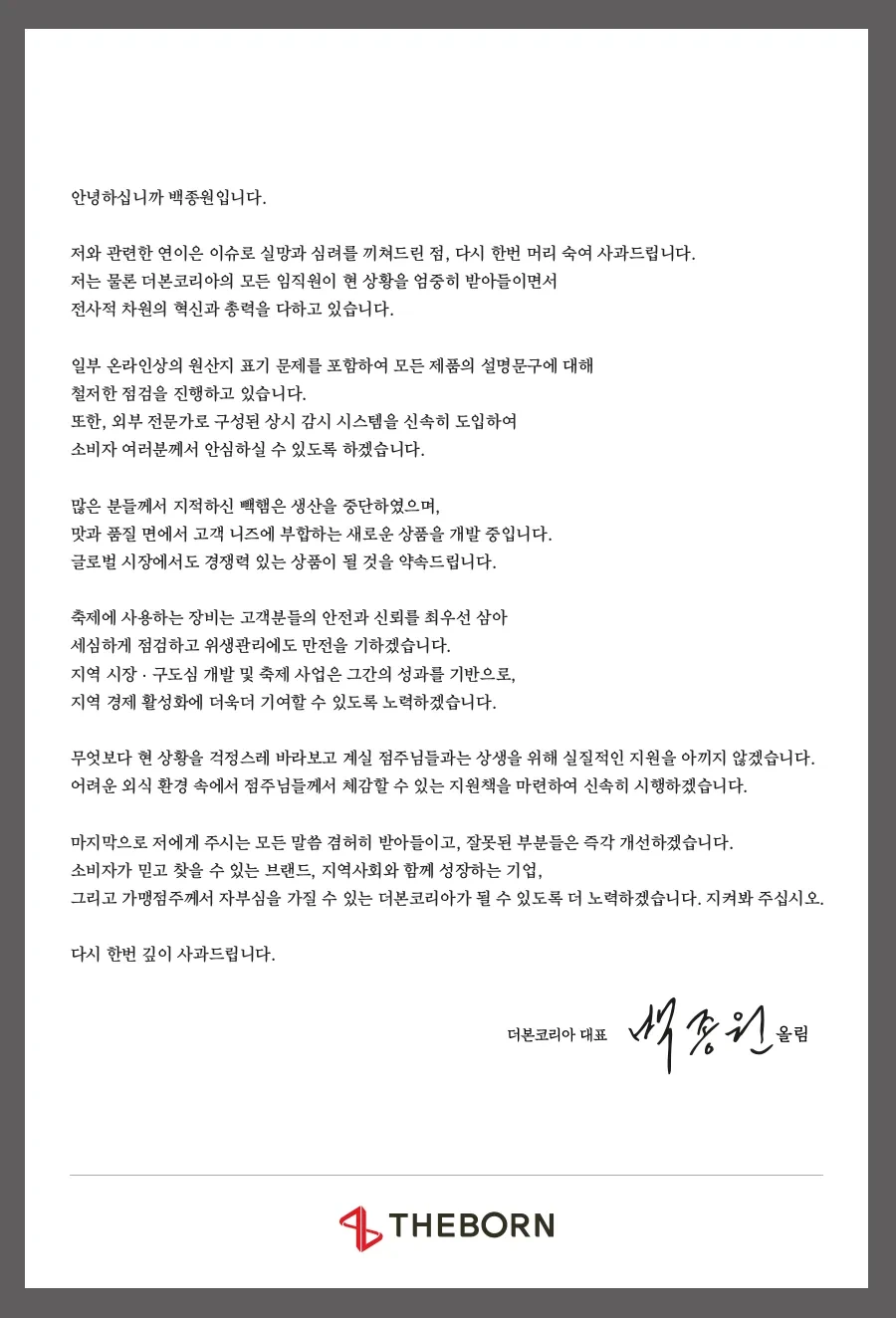 최근 더본코리아는 여러 가지 품질 문제와 위생 문제로 논란에 휘말린 바 있습니다. 특히 일부 제품에서 품질 이슈가 발생하거나 위생 상태가 불안정하다는 지적을 받으며, 이에 대한 여론이 악화되었습니다. 백종원 아저씨는 기업인으로서 이 문제들에 대해 책임을 느끼고 결단을 내린 것으로 보입니다. 그는 "모든 문제는 저에게 있다"며, 자신의 책임을 지고 문제를 해결하려는 의지를 보였습니다.