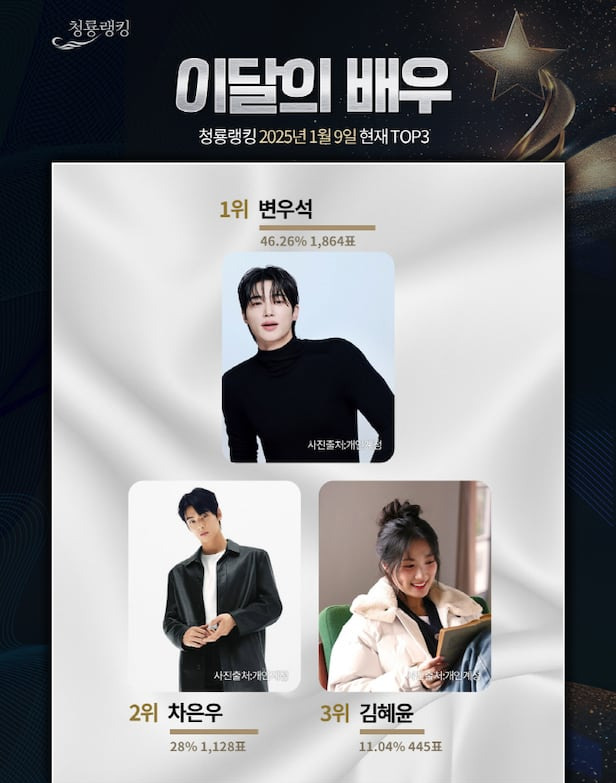이 이미지는 2025년 1월 배우 순위를 보여주는데, 변우석이 46.26%의 투표를 받아 1위를 차지한 것을 확인할 수 있습니다.