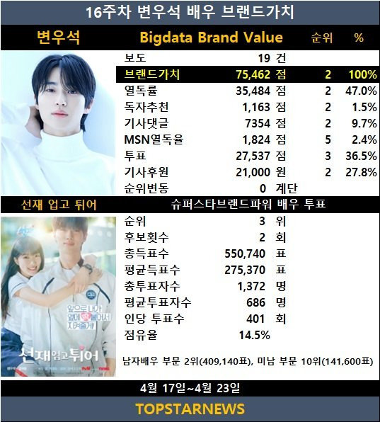 이 이미지는 변우석의 브랜드 가치가 75,462점으로, 전체 2위에 해당하는 점수를 기록한 것을 보여줍니다. 그의 미디어 노출, 소셜 미디어 언급, 투표 통계 등 다양한 메트릭스를 포함하고 있습니다.