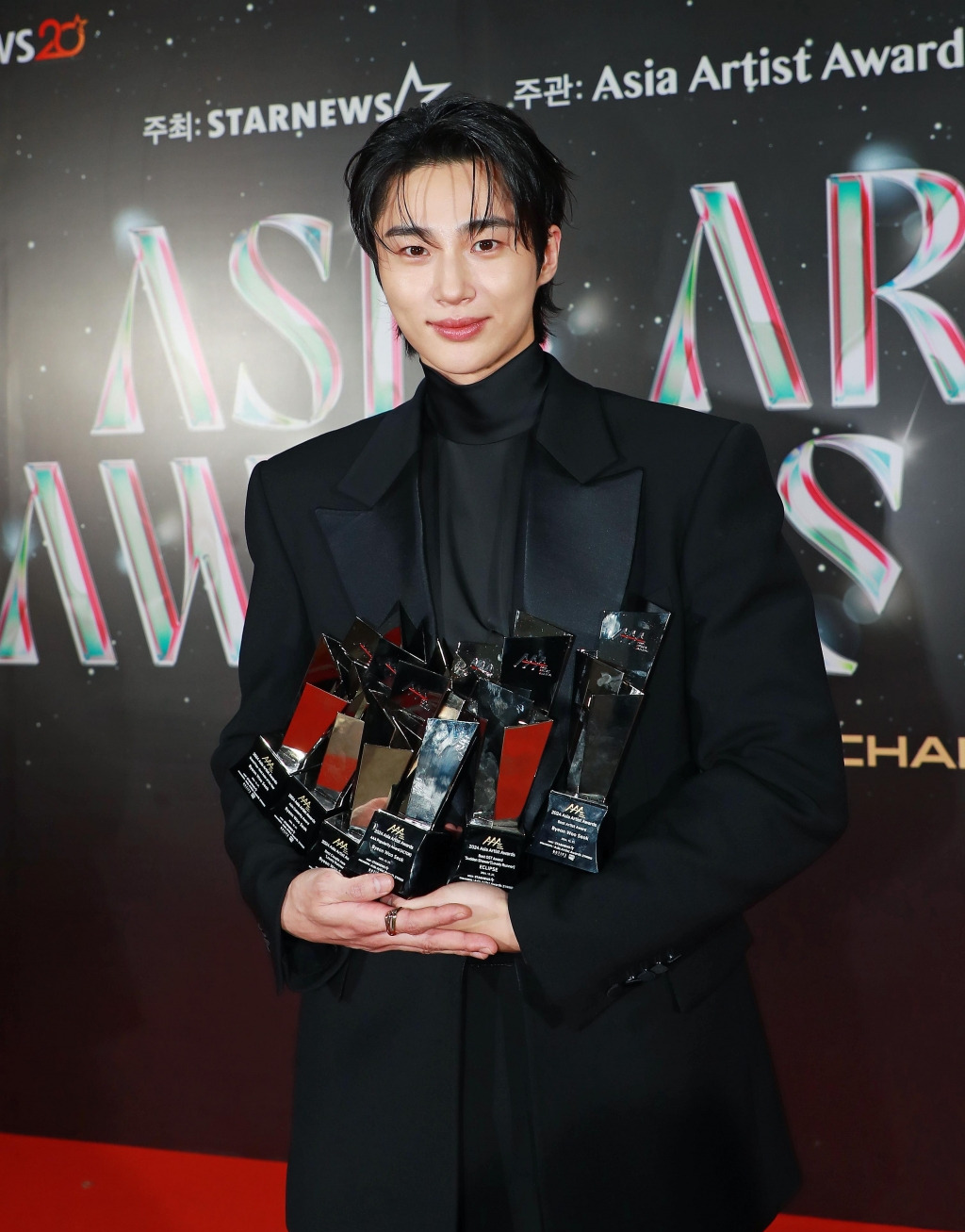 이 이미지는 아시아 아티스트 어워드에서 수상한 변우석의 모습을 담고 있습니다. 그는 수많은 상을 수상하며 자신의 성과를 자랑스럽게 보여주었습니다.