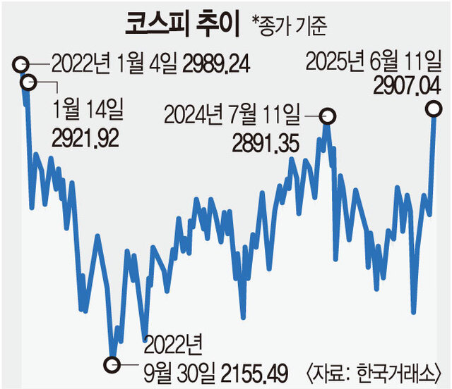 12일 한국거래소에 따르면 코스피는 전날 1.23% 오른 2907.04에 마감했습니다. 지수가 2900선을 넘어선 것은 2022년 1월 18일 이후 처음입니다. 이달 들어 6거래일 동안 7.76% 상승했으며, 연초 대비로는 21.15% 올랐습니다. 이러한 상승세는 새 정부의 정책 모멘텀과 글로벌 수급 개선이 맞물린 결과로 분석되고 있습니다.
