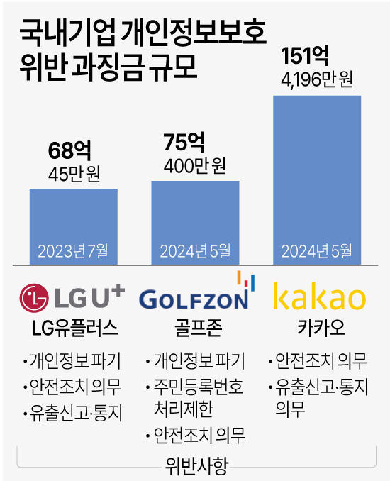 최근 국내 기업들이 개인정보 보호법을 위반하여 부과받은 과징금 현황을 살펴보면, LG Uplus, Golfzon, Kakao 등 여러 기업이 큰 금액의 과징금을 부과받았습니다. 예를 들어, LG Uplus는 6.8억 원, Golfzon은 7.5억 원, Kakao는 15.1억 원의 과징금을 받았습니다. 이러한 수치는 기업들이 개인정보 보호에 더욱 신경 써야 함을 시사합니다.