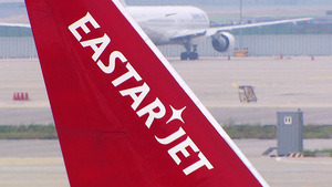 이스타항공의 항공기 꼬리 부분에 로고가 잘 보이는 모습입니다.