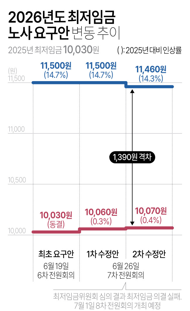 현재 내년도 최저임금 관련 노사 간 격차는 약 1150원에서 1270원 사이로 좁혀지고 있는 상황입니다. 이는 노동계와 경영계의 요구안이 점차 근접하고 있음을 나타냅니다. 특히 3차 수정안에서는 노동계가 시간당 1만1360원(13.3% 인상), 경영계가 1만90원(0.6% 인상)을 제시하여 격차가 1390원에서 1270원으로 감소했습니다. 이후 4차 수정안에서는 노동계가 1만1260원(12.3% 인상), 경영계가 1만110원(0.8% 인상)을 제시하며 격차는 다시 줄어들어 1150원이 되었습니다.