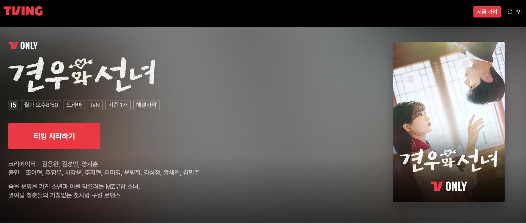 이제 TVING 로그인 후 “견우와 선녀” 검색 또는 Prime Video에서 직접 시청해 보세요!