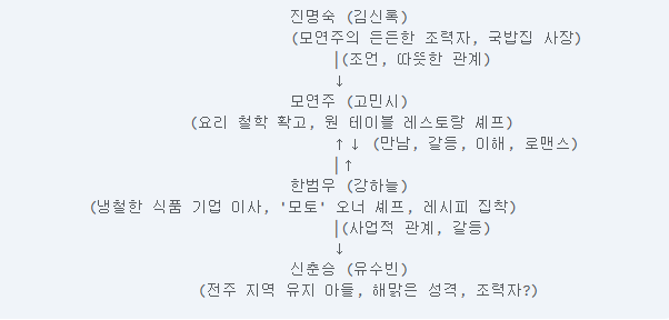 - 한범우 ↔ 모연주: 식당 인수자 vs 셰프로 만나 갈등 → 이해 → 협력 → 연인