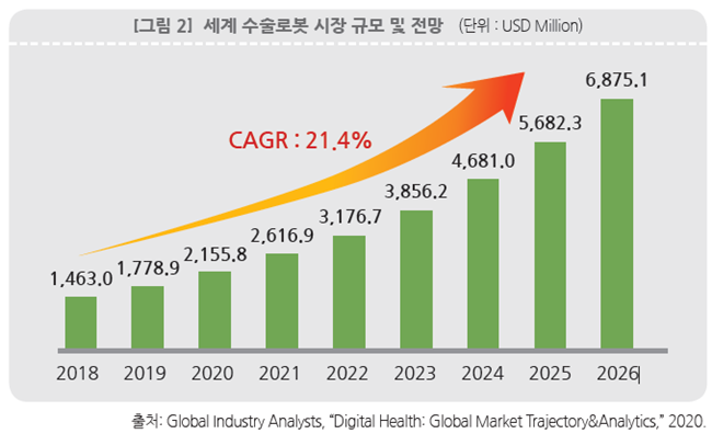 로봇 수술 시장은 2018년 1,463백만 달러에서 2026년에는 6,875.1백만 달러로 성장할 것으로 예상되며, 이는 연평균 성장률(CAGR) 21.4%를 기록하는 것입니다.