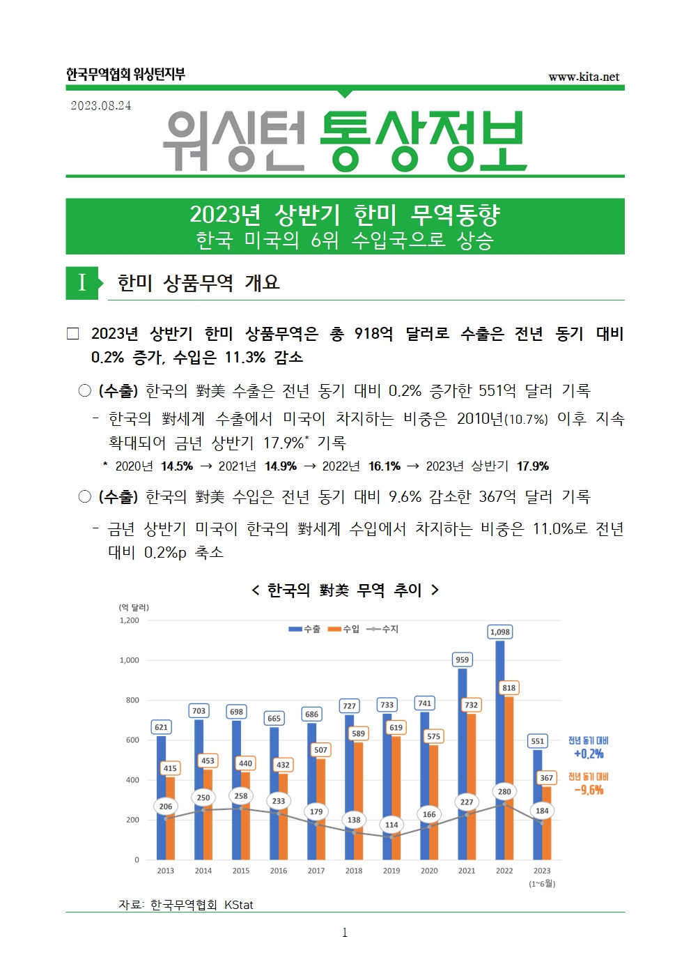 한국의 무역 현황은 최근 몇 년간 변화가 있었습니다. 2023년 상반기 한미 무역동향에 따르면, 한국의 총 수출액은 918억 달러로, 전년 대비 0.2% 증가했습니다. 반면, 수입은 11.3% 감소했습니다. 이러한 변화는 한국의 경제 구조와 글로벌 시장의 변화에 기인한 것으로 분석됩니다.