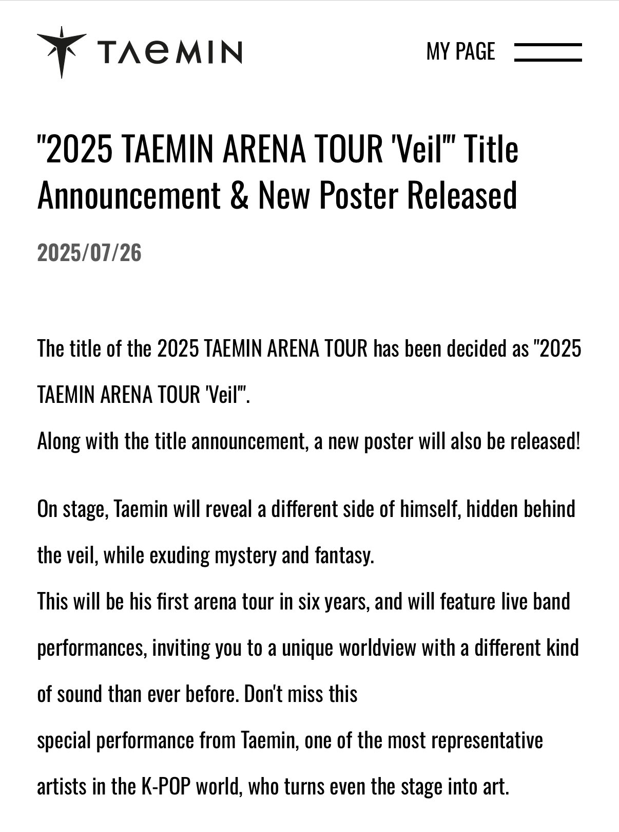 태민의 새로운 도전과 기대가 가득한 이번 아레나 투어 'Veil'은 팬들에게 잊지 못할 경험을 선사할 것입니다. 많은 관심과 응원 부탁드립니다!