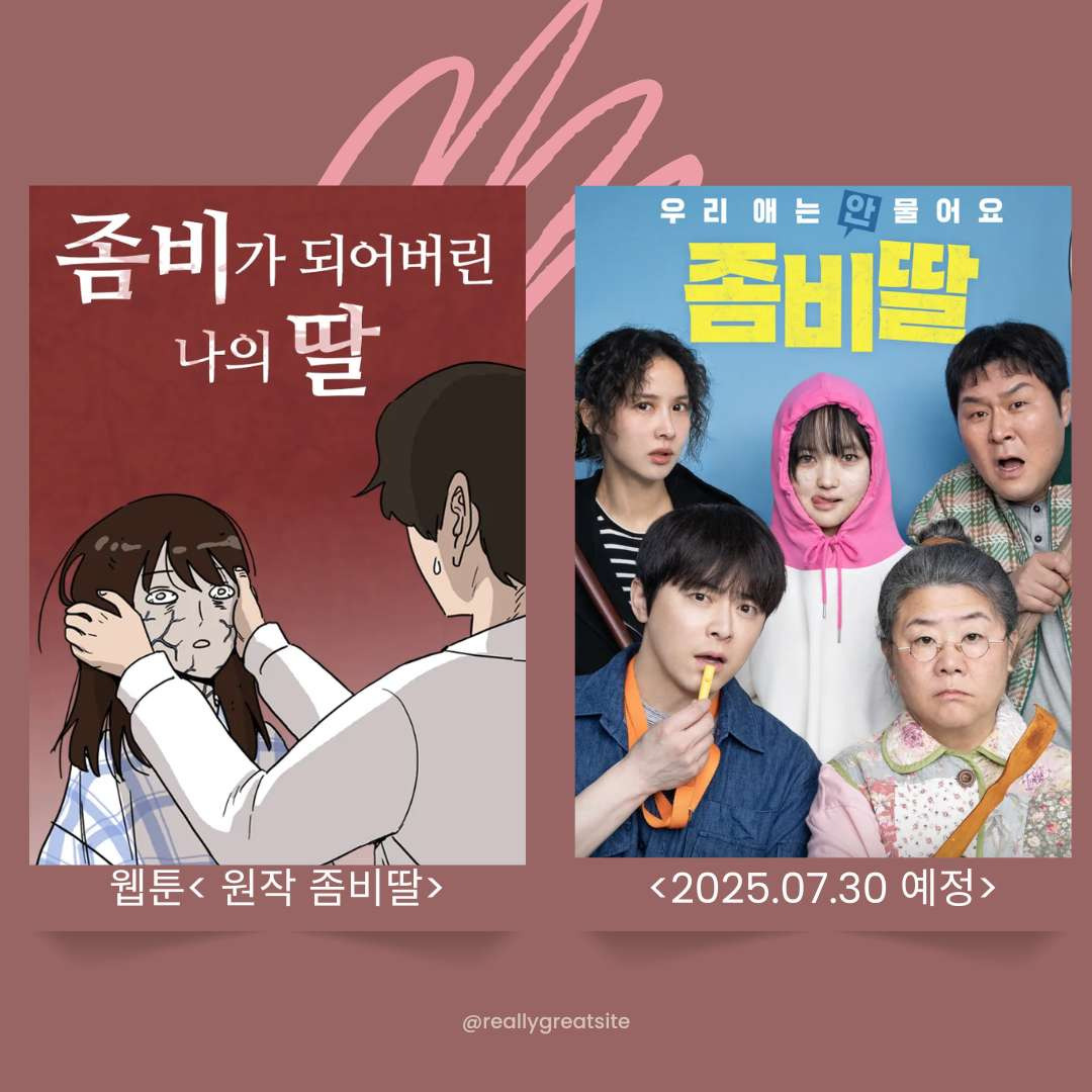 '좀비딸'은 이윤창의 웹툰 '좀비가 되어버린 나의 딸'을 원작으로 한 작품입니다. 이 영화는 세상에서 마지막으로 남은 좀비가 된 딸을 지키기 위해 극비 훈련에 돌입한 아빠의 코믹한 이야기를 담고 있습니다. 주연인 조정석 외에도 이정은, 조여정, 윤경호, 최유리 등 다양한 배우들이 출연하여 풍성한 볼거리를 제공합니다.