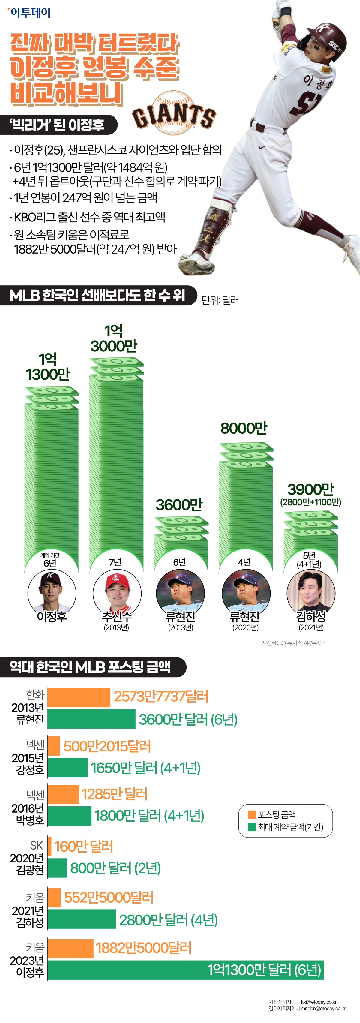 진짜 대박 터트렸다…이정후 연봉 수준 비교해보니 [인포그래픽]